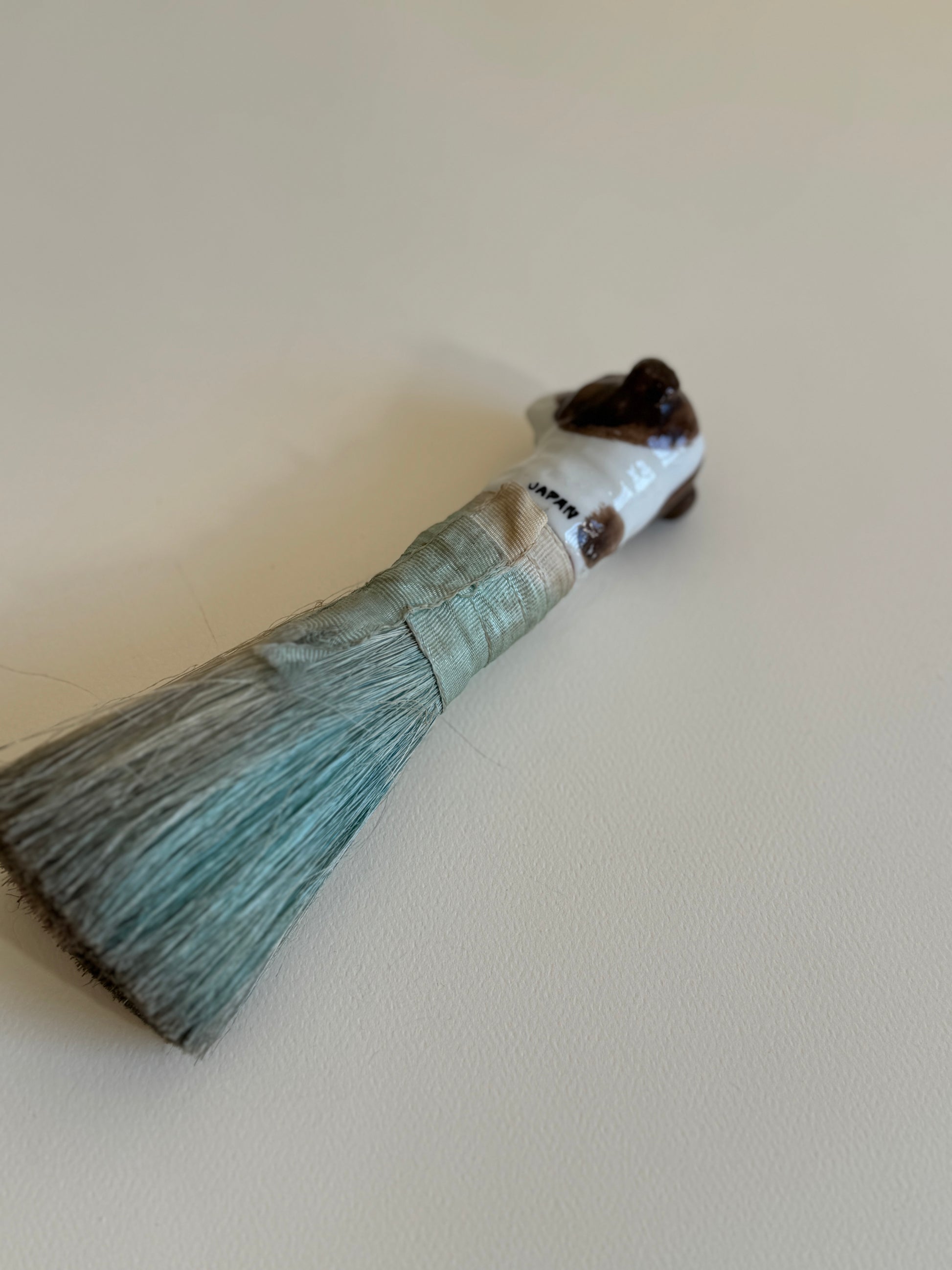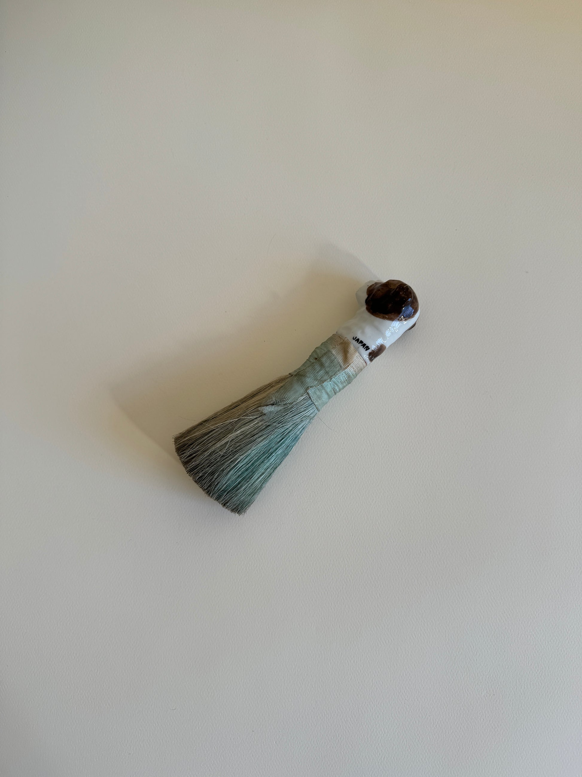 A very sweet porcelain dog head brush from the 1930s. Looks like a Boston Terrier? Made in Japan, like many half doll accessories made at the time. Overall beautiful condition, surface wear from use, and fading to the original straw colors — in the last photo you can see that the brush is multi-colored in the center!
